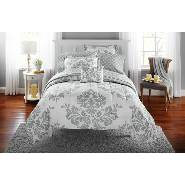 Mainstays Classic Noir 7 Piece Bed In A Bag Bedding Comforter Set Twin Twin Xl Grey Walmart Com Farmhouse Bedding Sets Damask Bedding Bedding Sets Grey