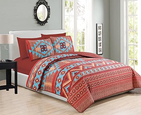 Western Southwestern Native American Tribal Navajo Design 6 Piece Set Multicolor Turquoise Red Orange Brown King Size Bedspread Quilt Coverlet With King Sheet Set Amazon Co Uk Kitchen Home